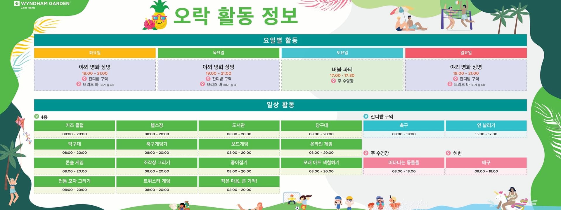 Bạn sẽ được khám phá sự kết hợp hoàn hảo giữa thư giãn và phiêu lưu tại Wyndham Garden Cam Ranh. Tận hưởng bãi biển riêng hoang sơ và hồ bơi vô cực nước mặn, luôn năng động với phòng tập thể dục được trang bị đầy đủ thiết bị và nhiều hoạt động ngoài trời khác nhau. Bé con chắc chắn sẽ yêu thích Câu lạc bộ Trẻ em và các thành viên sẽ thích phòng Giải trí với bi-a, bóng đá, bóng bàn,... và một thư viện ấm cúng. Ở đây có tất cả niềm vui dành cho tất cả mọi người, cho dù bạn muốn nghỉ dưỡng yên tĩnh hay trải qua kì nghỉ sôi động.